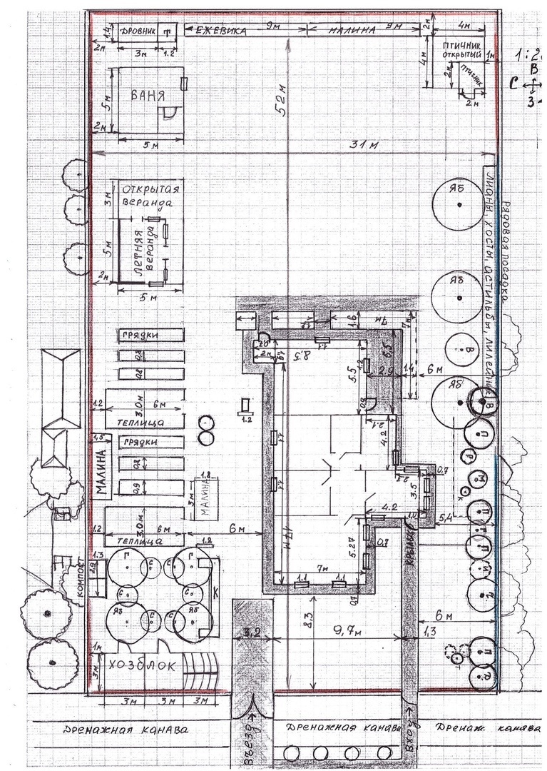 Посмотрите на два плана. Первый - чистый лист с постройками, а второй - цветной рабочий план, который уже претворяется в жизнь, радуя всех членов семьи. Каждая дорожка, каждая полянка - рассчитаны по размерам. Подобраны кустарники и многолетники по микроклимату. Выбрана удобная садовая мебель. Получился план про жизнь семьи. Который просто сделать, не растягивая на бесконечные стройки и переделки, понимая, что в первую очередь, а что в следующем сезоне 👍 ⠀ 👁🗨Давайте вместе рассмотрим место отдыха у кострища. Площадка 6 на 6 метров, в центре круглая чаша диаметром 1 метр, три скамейки. Площадка рядом с летним домиком и баней. Здесь удобно собираться большой компанией - достаточно места как у горящего огня, так и на веранде летнего домика. Можно даже засидеться до рассвета. Кустарниковая композиция отделяет зону с кострищем живописной стеной - не будет мешать тем, кто решил вовремя лечь спать в доме. А так же будет интригой для тех, кто впервые в саду - вышли на полянку полюбоваться