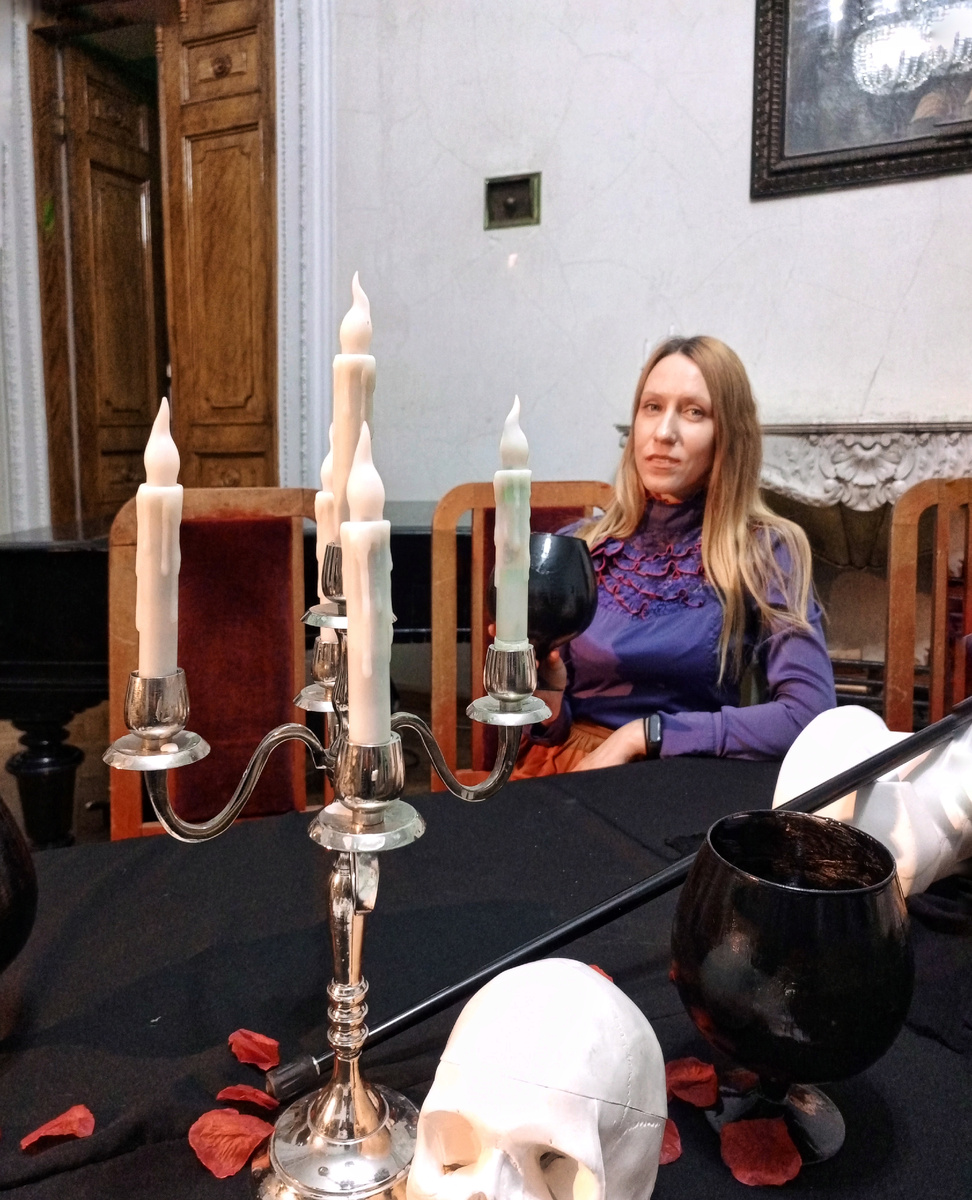В честь премьеры нового иммерсивного спектакля по драматургическому циклу "Маленькие трагедии" Александра Сергеевича Пушкина в особняке Мухиных состоялось необычное мероприятие для представителей СМИ. Погружение в тематику постановки мы начали с экскурсии по усадьбе с историком и знаменитым москвоведом Виталием Калашниковым. Библиотека-читальня имени Пушкина находится в уникальном здании ХIX века, которое принадлежало чете Мамонтовых, а затем и Мусиных. Мы узнали о строительстве особняка и его интересных владельцах, с упоением представляли, как особняк выглядел сто лет назад, мысленно спускались с терассы (от которой осталась лишь дверь на втором этаже) в сад с беседкой (сейчас там парковка бизнес-центра), нашли уникальное клеймо фабрики на великолепной чугунной лестнице - визитной карточке особняка. Мы узнали, что же связывает особняк с Пушкиным. Библиотека была создана по постановлению Мосгордумы в 1899 году в честь 100-летия со дня рождения Александра Сергеевича, но изначально на