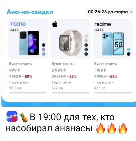 Доброй ночи всем Сегодня в группе скидок обнаружила такую информацию о акции Озон Что за собранные в приложении ананасы получаем отличные скидки Пример :Телефон за 1000 рублей Акция проверенная и уже много кто получил свою выгоду от покупок Итак , что для этого нужно Заходим в приложение Озон Открываем любой товар и находим внизу табличку Нажимаем " забрать" Собираем побольше ананасов и участвуем в акции Ни в каждой карточке товара есть ананас , но очень во многих Тут прописаны условия 👇 Достаточно неплохая акция Пожалуй перед сном пойду ка соберу ананасы 🤗 Всем доброй ночи 💓 А вы будете участвовать в этой акции?
