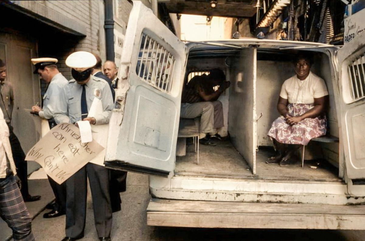 Надпись на плакате, изъятом у задержанных: «Если Хрущев может здесь есть, то почему это не можем делать мы». В то время чернокожие жители не могли питаться вместе с "белыми". Только в заведениях с пометкой "цветные".