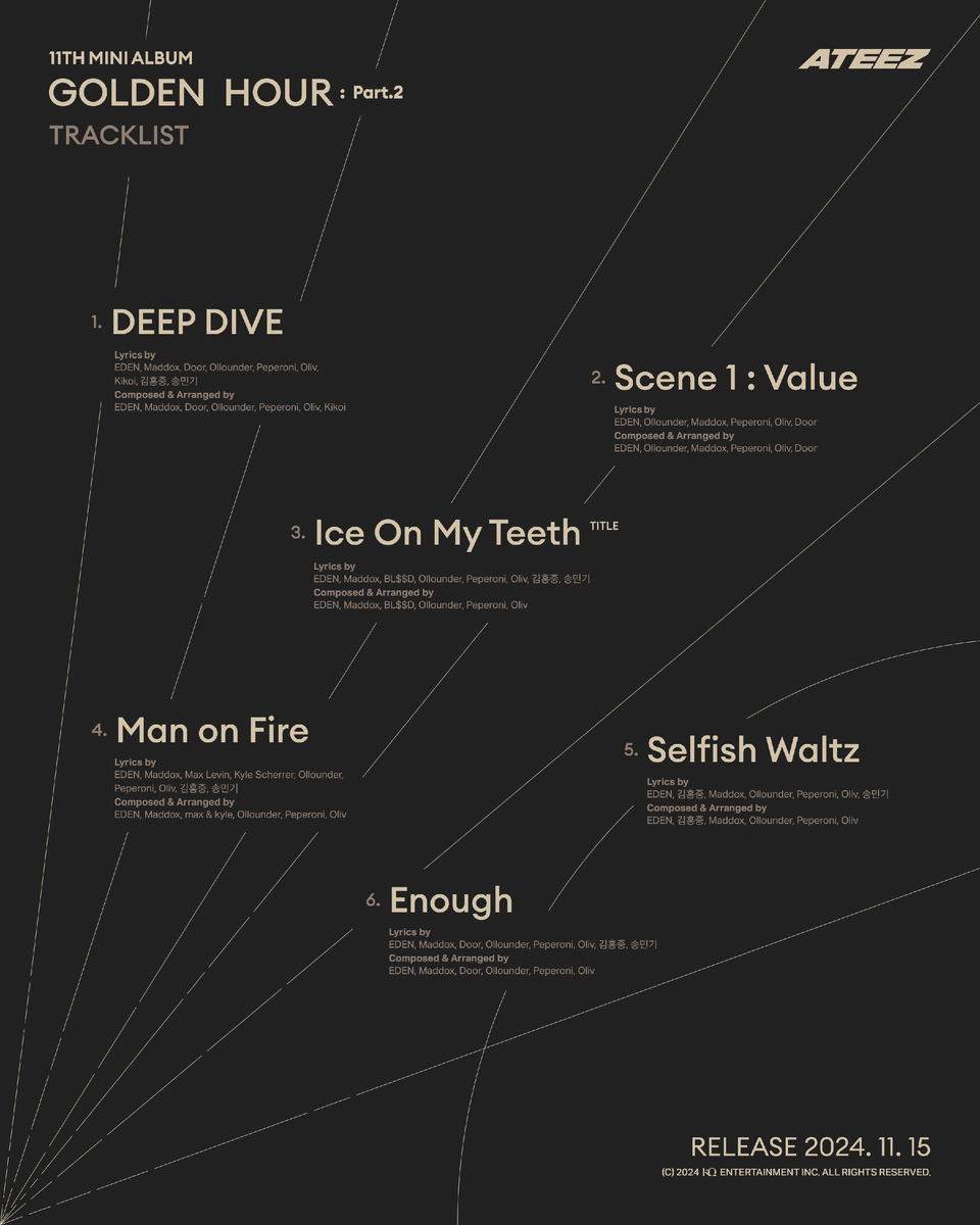 KQ Entertainment представила постер с треклистом нового мини-альбома группы Эйтизи (ATEEZ), который получил название "골든 아워: 파트2" (GOLDEN HOUR: Part.2). Анонс был опубликован 1 числа на официальных страницах в социальных сетях. Постер отличается уникальным дизайном: на черном фоне переплетаются прямые и изогнутые линии, создавая эффект света, который исходит из одной точки и распространяется в разные направления. Это оформление символизирует динамику и энергию нового альбома. В новом релизе Эйтизи представлены шесть треков, каждый из которых привносит разнообразие в музыкальную палитру: Альбом охватывает различные музыкальные жанры, предлагая слушателям запоминающиеся моменты и впечатления. Члены группы, 홍중 (Hongjoong) и 민기 (Mingi), активно участвовали в создании альбома, написав тексты для пяти из шести треков. Это подчеркивает их растущую музыкальную зрелость и творческий подход. Эйтизи возвращаются после шестимесячного перерыва с продолжением своего предыдущего альбома "골든 아워" (GOLD