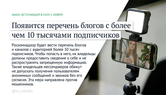 Роскомнадзор будет вести перечень блогов и каналов с аудиторией более 10 тыс. подписчиков. Чтобы попасть в него, их владельцы должны предоставить сведения о себе и не распространять запрещенную информацию. Также владельцев мессенджеров обяжут не допускать получения пользователем анонимных сообщений и звонков без его согласия. Эта мера направлена против мошенников.