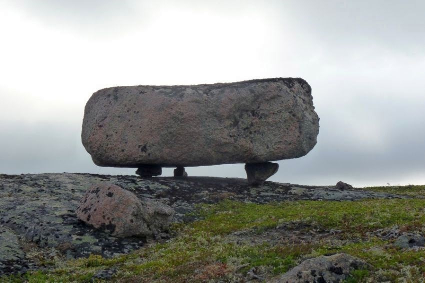 Приплющенный валун метра 3 в диаметре лежит на трех маленьких камешках, а под ним как бы вершина огромного валуна. Специально посмотрел - просвет есть.