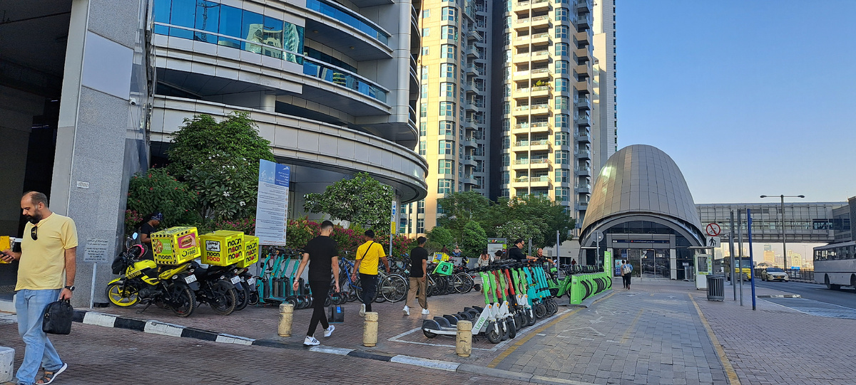 В этом районе несколько станций метро. Мы добирались от DMCC. У выхода понравилась велосипедная и самокатная стоянка. Прям как в любимой Москве.