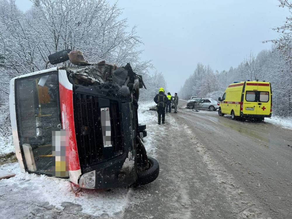 Автобус перевернулся на бок. В ДТП пострадал водитель иномарки. В момент аварии пассажиров в автобусе не было.