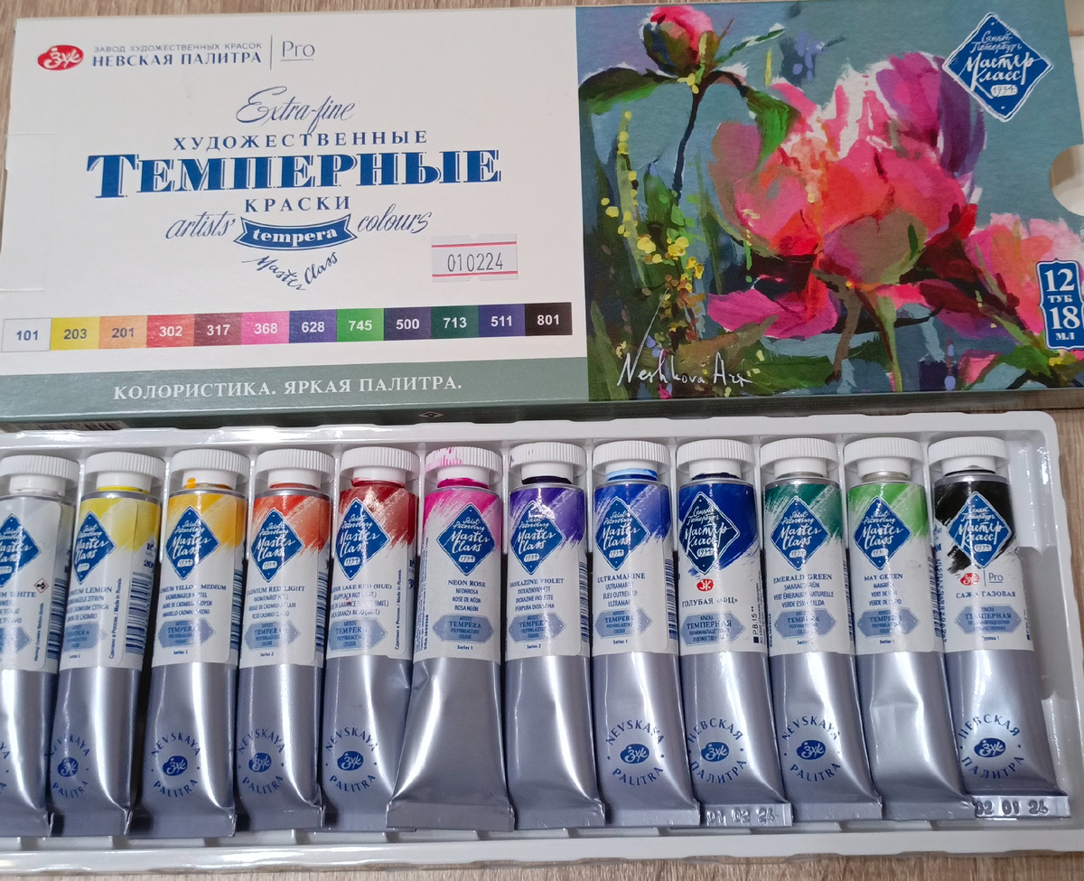 Давно подумывала ее попробовать. Пожалуй единственная из красок которую еще не пробовала. Гуашью все школьную пору рисовала (стенгазеты были на мне). Акрилом больше в декораторских и технических целях(рамы покрасить) пользуюсь постоянно. Масло время от времени пробую, но к сожалению резкий запах разбавителей до головной боли доводит. Да и в условиях квартиры не больно-то попишешь им. Акварель постоянно с собой.... А вот темперу все время обходила как-то. Не знаю почему. Наконец дозрела, только думала сразу набор или поштучно свои ходовые в акварели цвета взять. Поштучно объем тюбиков больше и в итоге для начала взяла набор, смешать то не проблема. Позже уже поштучно буду брать то, что будет нужно.. Сразу сделала себе выкраски и на крафте и в своем дневнике. Первое что под руку попало. Но дома и картон грунтованный есть и несколько холстов и фанера. Фанеру грунтовать только надо, а так вперед и с песней. Сразу чтобы краску попробовать делала небольшие зарисовки, первое что в голову пр