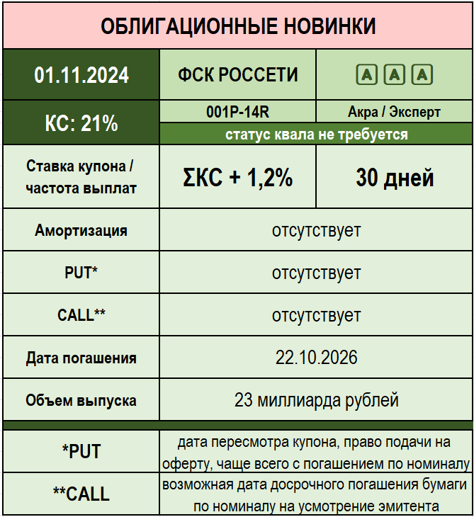 🍁 Доброе утро, друзья! Последний осенний месяц начинается с новинки, к которой, справедливости ради, надо отнестись с должной настороженностью. ✅ В обед биржевые стаканы заполнятся предложениями по: 1️⃣ ФСК РОССЕТИ 001Р-14R (🅰️🅰️🅰️) 🔢 ISIN: $RU000A109ZQ8 🔸 Купон плавающий: ΣКС + 1,2% 🔸 Значение рассчитывается ежедневно 🔸Без оферт и досрочного погашения 🔸 Погашение через 3 года 🔸 Последний рейтинговый отчет: https://www.acra-ratings.ru/press-releases/5157/, https://raexpert.ru/releases/2024/apr12h Кажется мне, что выпуск один из последних, которому удалось занять со столь низкой премией к ключевой ставке, по крайней мере в ближайшее время. В новую реальность с премией под 2% погрузило нас вчера Росгидро, а флоатеры 🅰️🅰️🅰️, до последнего момента считавшиеся тихой гаванью, тоже могут начать свою переоценку вместе со всем рынком. Буду рад ошибиться, но ситуация выглядит с моей колокольни именно так. Эмитент в особом представлении не нуждается, так что задерживать вас не б