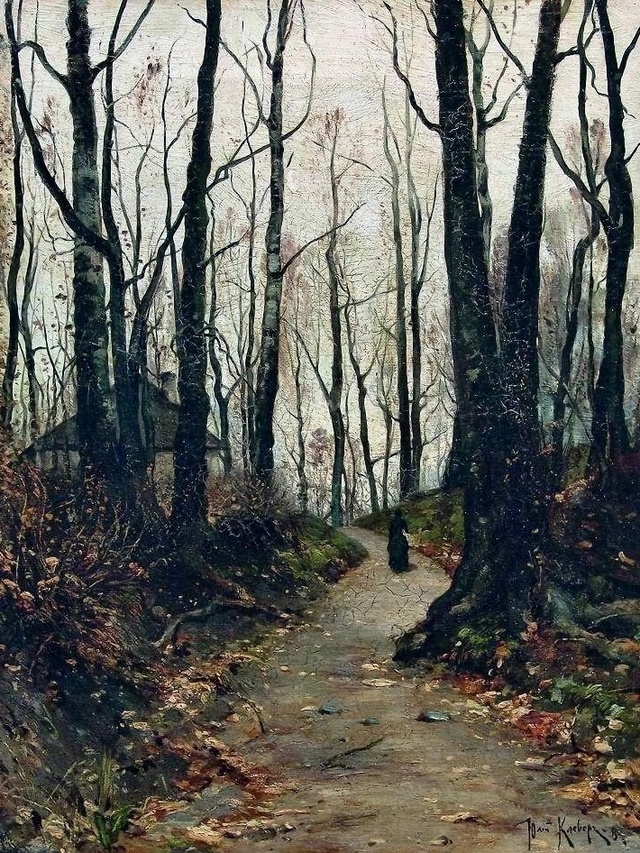 Поздняя осень, листья уже облетели и голые деревья тянут к небу свои черные стволы. Тусклый свет едва пробивается сквозь серое небо. Но в этой обнаженности дороги, в этой прозрачности леса есть своя прелесть. Маленькая женская фигура делает этот пейзаж совсем не мрачным, а живым и даже бодрым.