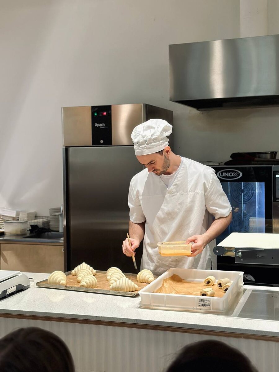Masa Madre: пекарня с завтраками со входом во дворе архитектурного памятника. Впечатлил удаленный заказ блюд, когда ты можешь абсолютно не взаимодействовать с официантом, сложить завтрак в корзину, оплатить по сбп и уже через пару минут пить кофе. В дизайне вау: полки с хлебом, витрина десертов без стекла, гигантский вентилятор-мотор под потолком.