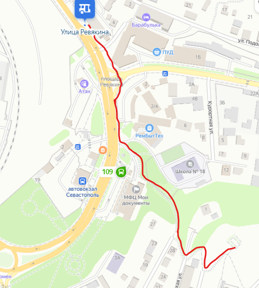 Выйти нужно на остановке "Ревякина" ( или "Автовокзал", если ехать с Корабельной стороны).