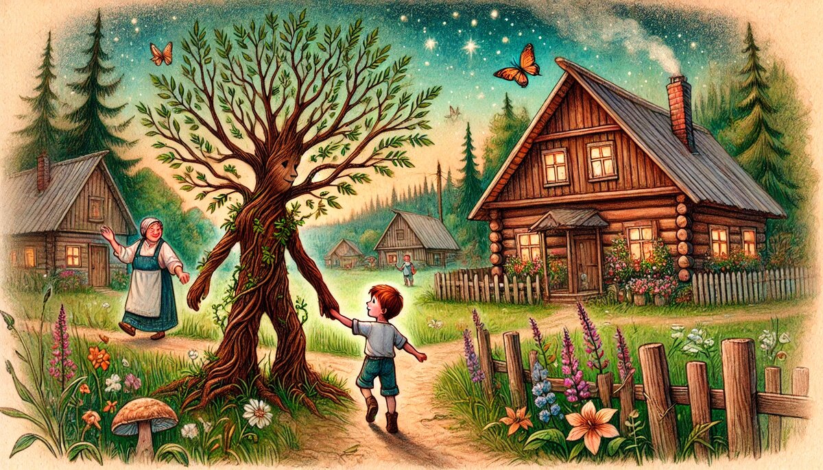 В одном городе жил маленький мальчик по имени Тёма. Он очень любил свою бабушку и дедушку, которые жили в деревне. Каждое лето Тёма с радостью ехал к ним в гости. В деревне все было по-другому. Воздух пах травой и цветами, а не выхлопными газами. Вместо асфальта – пыльная дорога, вместо многоэтажных домов деревянные избушки. Всё лето Тёма бегал по зелёному лугу, ловил бабочек сачком, помогал дедушке косить траву. Бабушка учила его печь вкусные пироги с ягодами, а вечером они сидели на крылечке и смотрели на звезды. Однажды, Тёма заблудился в лесу. Он искал красивую бабочку с красными крыльями, но пока искал её по лесу, потерял дорогу домой. Тёма испугался и начал плакать. Вдруг он услышал нежный голос: «Не плачь, маленький! Я тебя найду!» Это была старая сосна, которая росла на краю леса. У неё были длинные ветви, как руки, и она могла видеть все вокруг. Как только ветви сосны взяли Тёму за руку они отправились на опушку леса. Сосна показала Тёме, как ему вернуться домой, и мальчик быс