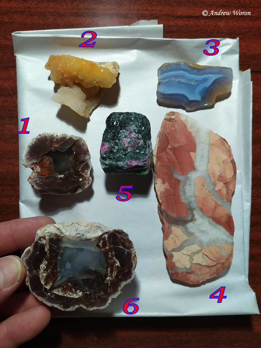 № 1 и № 6 – агаты в халцедоне, добытые в одном из карьеров вблизи Магнитогорска. Там они совсем другие, отличные от Синарских, Миасских и Северо-Уральских. Взял два, поскольку не смог выбрать между ними – рисунок везде уникальный и необычный, а цвет основной породы – шоколад.