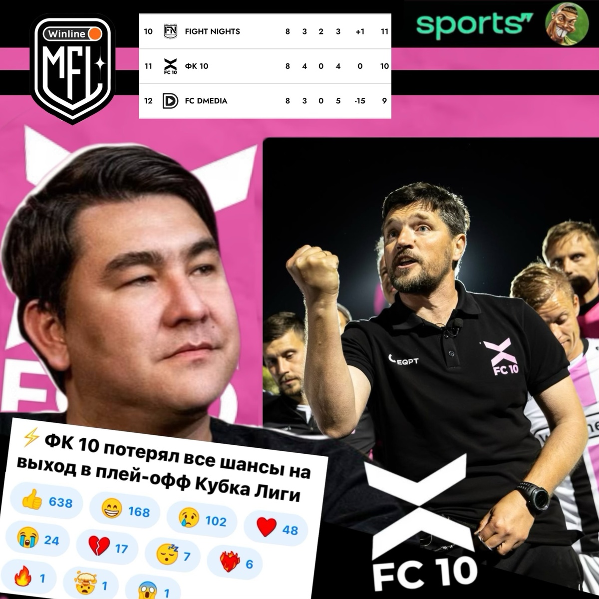 Медиафутбольная «Десятка» потерпела фиаско в Кубке Лиги. После восьми туров общего этапа турнира клуб Азамата Мусагалиева занял 11-е место – из 14 возможных.