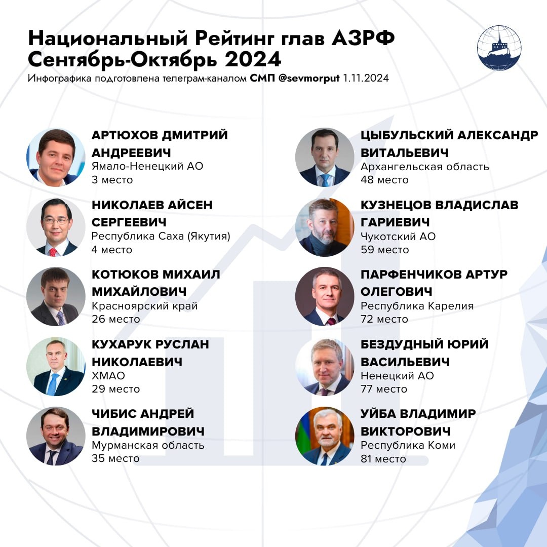 Лидерство среди северных губернаторов в рейтинге удерживает глава ЯНАО Дмитрий Артюхов. Несмотря на потерю одной строчки, он занял высокое третье место в первой группе национального списка. Артюхов совершил несколько успешных визитов в Москву, обсуждая на федеральном уровне инвестиции, экологию и мастер-планы опорных городов.