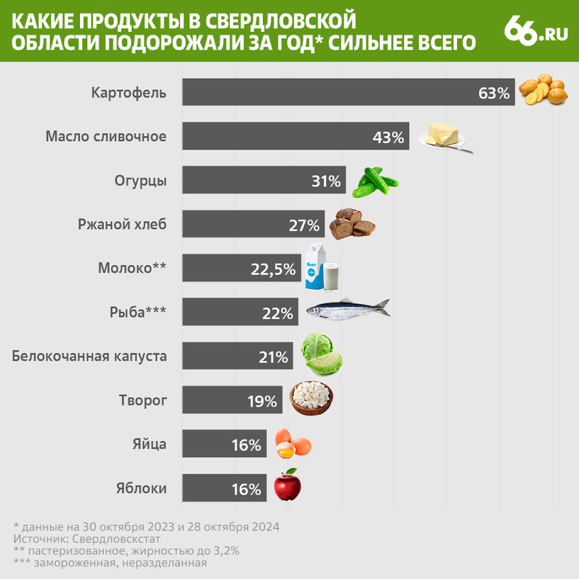 Инфляция в России превысила даже самые пессимистичные прогнозы, и осенью рост цен с учетом сезонности составил 9,8% годовых. Быстрее всего растут в цене продукты, даже по официальной статистике Свердловскстата. Так, сильнее всего за год подорожал картофель — на 63%. В конце октября 2023 года килограмм этого корнеплода стоил 21,6 рубля, а в октябре 2024 года — 35,3. Производители объясняют это снижением урожая из-за аномальной погоды и сокращения посевных площадей. На втором месте — сливочное масло. За год оно выросло в цене с 785 до 1122 рублей. Владелец компании «Талицкое молоко» Юрий Окунев считает, что причина в слишком дорогом сырье. В октябре крупные производители сливочного масла стали сокращать выпуск и приостанавливать отгрузку продукции в торговые сети. На третьем — огурцы. Они подорожали на треть. Но есть нюанс: с начала 2024 года овощ, напротив, подешевел. В январе 2024 года в среднем килограмм огурцов стоил 210 рублей, а сейчас — 126, то есть на 40% дешевле. Причина — сезон