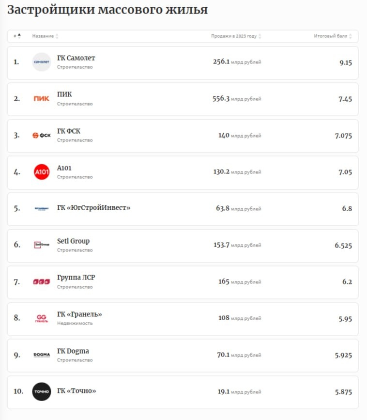 За первые шесть месяцев текущего года продажи застройщиков выросли на 38% по сравнению с аналогичным периодом прошлого года и составили 1,4 трлн рублей. В сегменте массового жилья первое место занял «Самолёт» с результатом 9,15 баллов, а лидер прошлого года, ПИК, снизил темпы строительства и занял второе место с результатом 7,45 баллов.