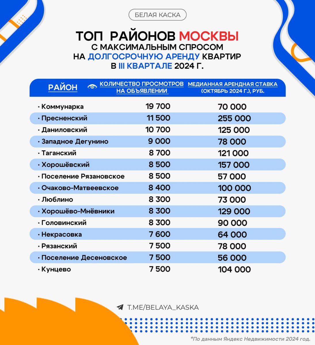 В III кв. 2024 г. при поиске съемной квартиры, арендаторы чаще всего рассматривали районы Коммунарка (Новая Москва), Пресненский (ЦАО) и Даниловский районы (ЮАО).
