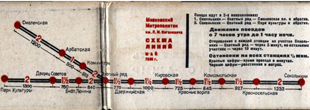 Обратите внимание на интересные детали. Например, красными цифрами показывали время в пути: 1 ½ — это 1,5 минуты между станциями. А ниже – длина перегона в метрах. В 1935 году поезда ходили каждые 5 минут на участке «Сокольники — Охотный ряд» и 10 минут на участках «Охотный ряд – Смоленская» и «Охотный ряд — Парк Культуры». Сейчас минимальный интервал на большинстве линий составляет всего 90 секунд! Все потому, что 88 лет назад на линии выходило гораздо меньше составов и не существовало еще Единого диспетчерского центра, который сегодня управляет движением поездов. Это мозг и сердце метрополитена.