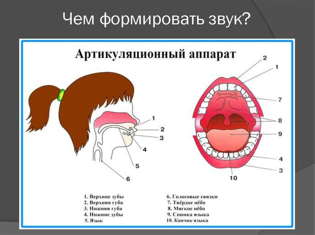 Артикуляционный аппарат - часть голосового аппарата, формирующая звуки речи. К артикуляционному аппарату относятся: ротовая полость (щеки, губы, зубы, язык, челюсти, небо, глотка, гортань). Артикуляция - активная работа рта в речи и в пении. Вялый артикуляционный аппарат, является причиной плохой дикции. Поэтому очень важно тренировать артикуляцию, чтобы при разговоре, а также пении, не страдало произношение. Артикуляция влияет на качество звука, если у вас правильно поставлено дыхание, включены резонаторы, гортань свободна, но звук кажется тусклым, не звонким, грустным, значим мышцы артикуляционного аппарата не работают в полной мере. Необходимо много трудиться над усовершенствованием артикуляционного аппарата, разрабатывать его технические возможности. Одним из самых эффективных способов коррекции речевых нарушений является систематическое использование в процессе пения вокально-артикуляционных упражнений, артикуляционных гимнастик. Артикуляционные упражнения и гимнастика направлены