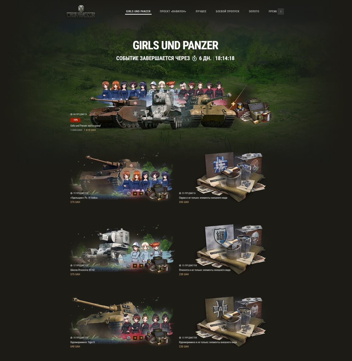 Полюбившаяся многим вселенная Girls und Panzer возвращается с тремя энергичными и очаровательными командами по сэнся-до! Неважно, преданный ли вы поклонник Girls und Panzer или только сейчас заинтересовались этой вселенной, у вас есть возможность взять под своё командование технику, вдохновлённую этим культовым сериалом! Даты: Наборы доступны с 31 октября, 12:00 по 7 ноября, 12:00 (GMT+3). Раздел в премиум магазине: eu.wargaming.net/shop/wot/gup/
