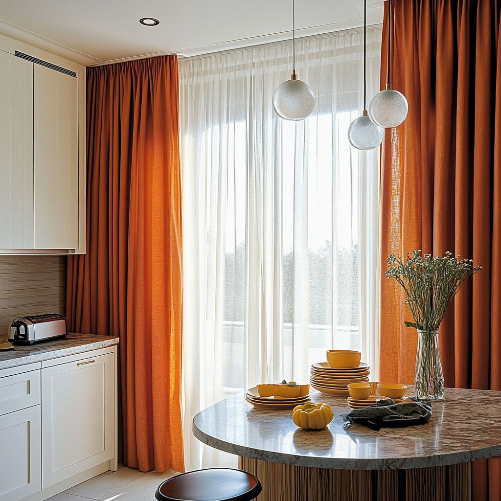 Для кухни можно выбрать оранжевые шторы в сочетании с нейтральными оттенками — белым, бежевым или серым. Это позволит избежать визуальной перегрузки и сделает пространство более сбалансированным. Если вы хотите добавить немного экзотики, рассмотрите сочетание оранжевого с зелеными акцентами — например, с растениями или посудой.