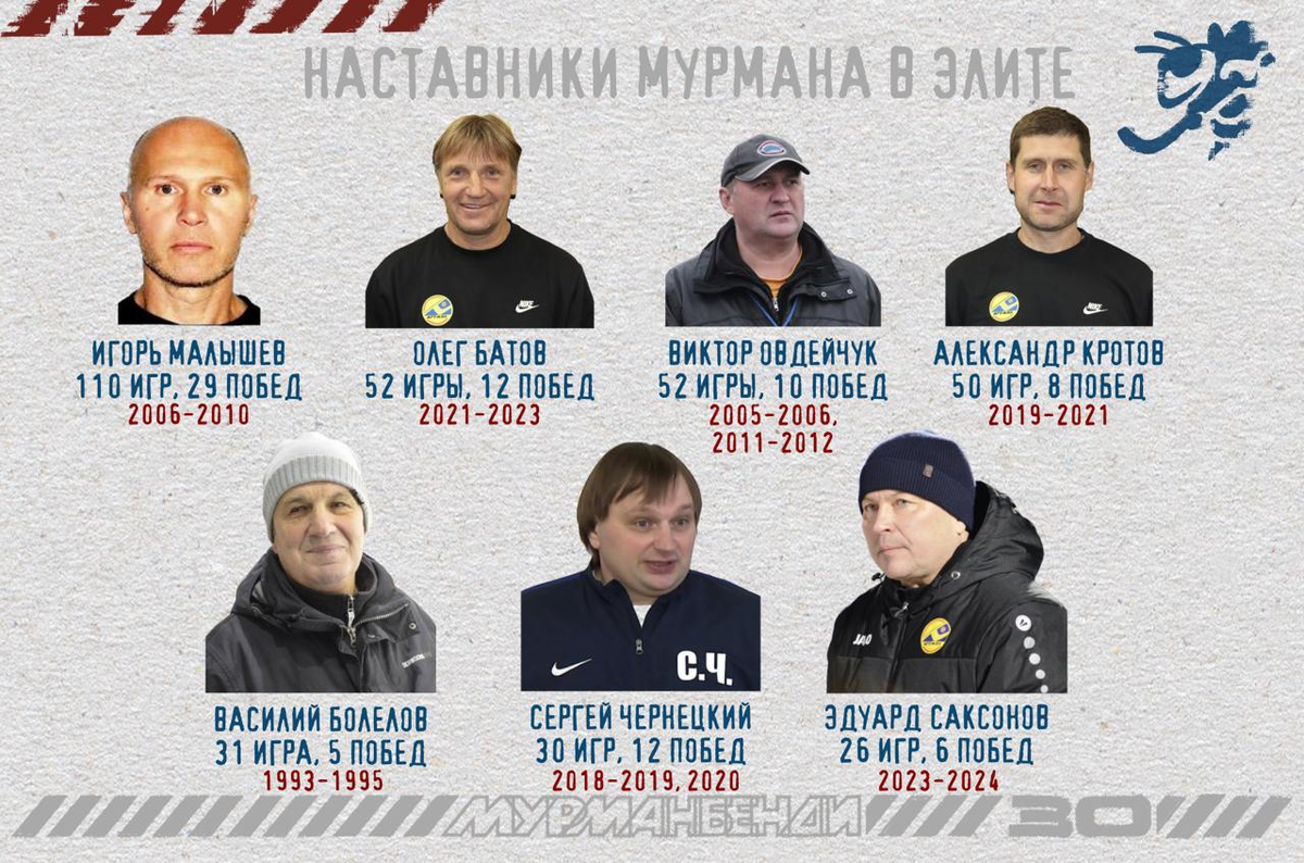 Наше всё мурманского бенди, человек, с именем которого неразрывно связана новая эпоха клуба (то есть новое с 2016 года юрлицо). Под руководством Сергея Сергеевича команда вырвалась из оков второго эшелона и спустя 6 лет вернулась в элиту. В первый же сезон команда Чернецкого добилась лучшего на тот момент результата в истории клуба - 11 место из 15. Надолго на посту главного тренера он не задержался, оставив за собой пост директора, и лишь на два матча подменив Кротова в концовке сезона 19/20. Имеет лучший процент побед в Суперлиге среди тренеров Мурмана - 36,6%.