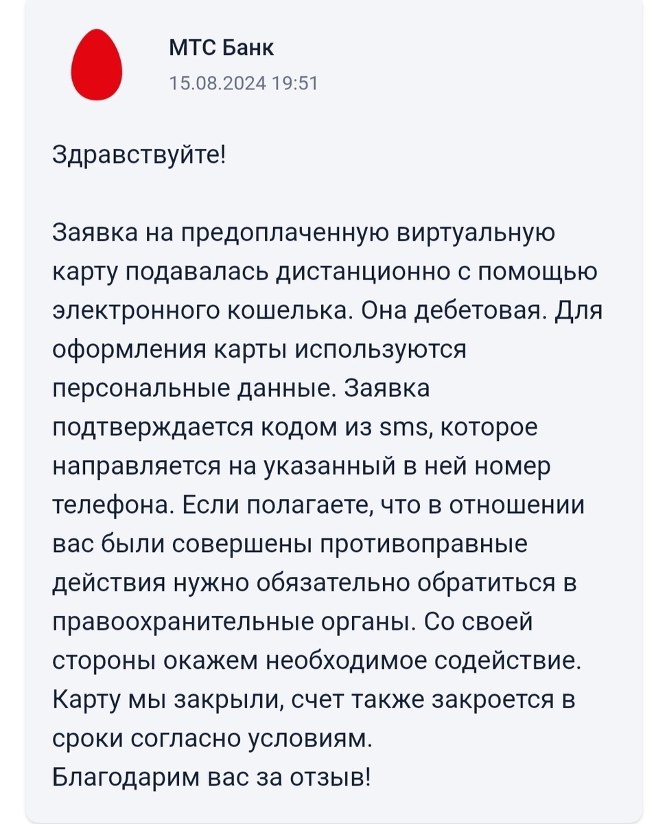 Тут есть важный момент, по которому я к сожалению, не смогу особо помочь – если мошенники не только открыли без вашего ведома карту и провели там финансовые операции, а МТС Банк посчитал что операции сомнительные, заблокировал карту и направил в ЦБ информацию о мошеннических действиях (161 ФЗ). В таком случае вы узнаете об этом, когда вам заблокируют счета, которые открывали уже вы сами в других банках. Тут могу только посоветовать почитать статью человека также пострадавшего от МТС Банка включая и блокировку от ЦБ https://pikabu.ru/story/blokirovka_schetov_po_fz_161_11743044