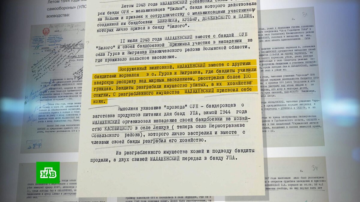 [ Смотреть видео на сайте НТВ ] Федеральная служба безопасности (ФСБ) рассекретила новые документы о зверствах националистов во время оккупации Западной Украины фашистами в 1943 году, о трагически известной Волынской резне. Материалы более полувека находились в архиве под особым грифом. В документах данные одного из первых эпизодов расправы в феврале 1943 года. Боевики организации украинских националистов, признанной в России экстремистской, напали на польское поселение в Сарнинском районе и расстреляли 137 мирных жителей. Следователи установили и непосредственных участников Волынской резни. Один из них − Василий Малаженский − член националистических отрядов, он проводил карательные акции. В 1943 году он руководил бандой, напавшей на села Гуров и Вигранка, а также убил 100 мирных жителей. Националисты после расправы занялись еще и грабежом. Факты зверств подробно задокументировали сразу после окончания войны. Однако многие националисты скрывались от советского правосудия на Западе. Кто