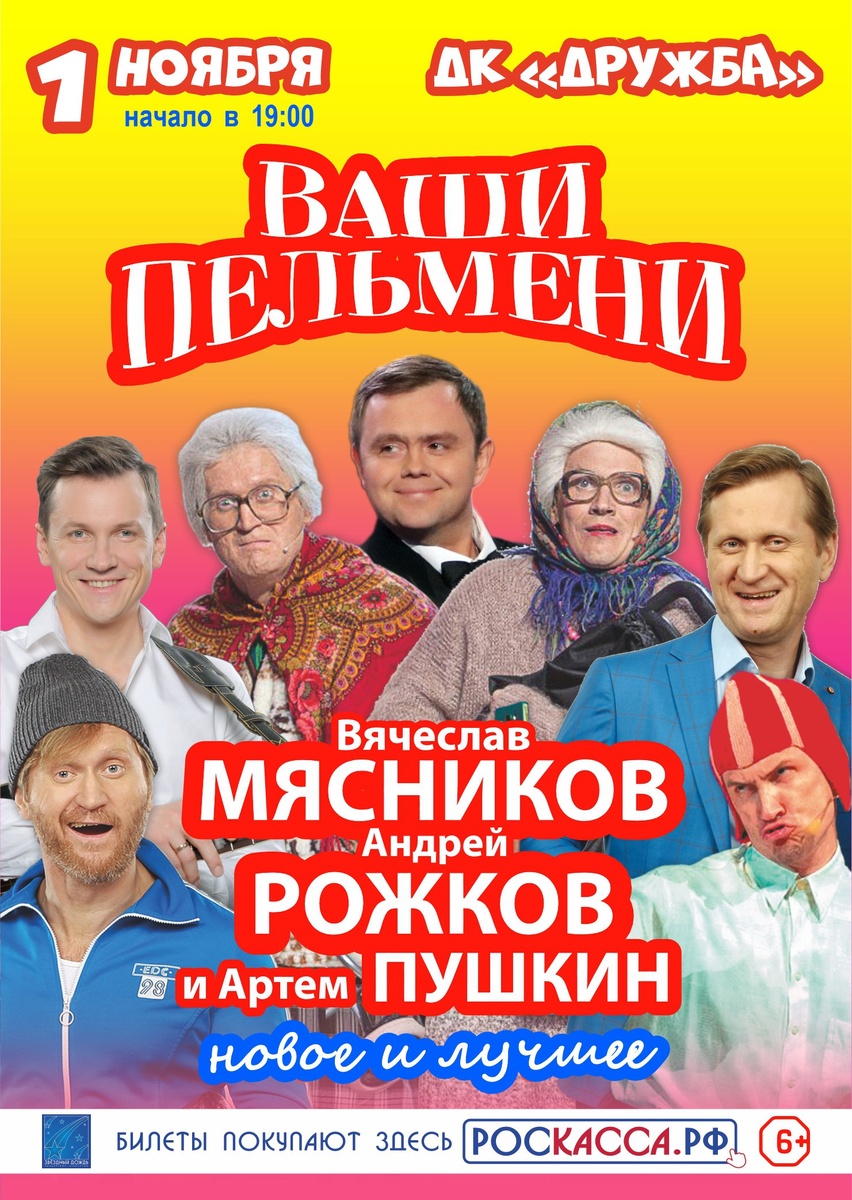 💥 Шоу "Ваши пельмени" в ДК "Дружба г.о. Чехов 🔥Вячеслав Мясников и Андрей Рожков приготовили для вас потрясающую, новую шоу-программу! Вести ее будет неповторимый Артем Пушкин🎤 📃В шоу включены как самые любимые вами номера, так и абсолютно новые! 📢Так что, друзья, не пропустите, ждем вас на наших концертах и обещаем вам, как всегда, прекрасную, неповторимую атмосферу, динамичную программу и потрясающее настроение!!! 💜Ваши Пельмени! Вячеслав Мясников и Андрей Рожков💜 🎟️Билеты в кассе ДК "Дружба" или онлайн 🚫 Возраст: 6+ 📆 01.11.2024 🕕 19:00 🏢 ДК «Дружба» 📍 г. Чехов, ул. Чехова, д.45 💰 Цена от: 2000 до 5000 ₽ 🎫 Купить билет: https://clck.ru/3DqDXj