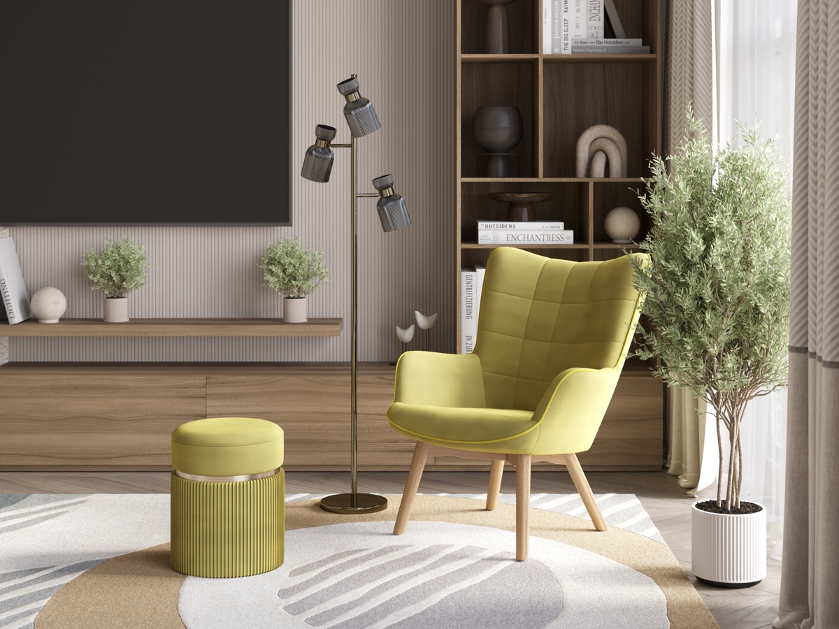 Фото интерьера: Кресло Манго с высокой спинкой, пуфик Миранада, торшер в стиле лофт бренда Moderli