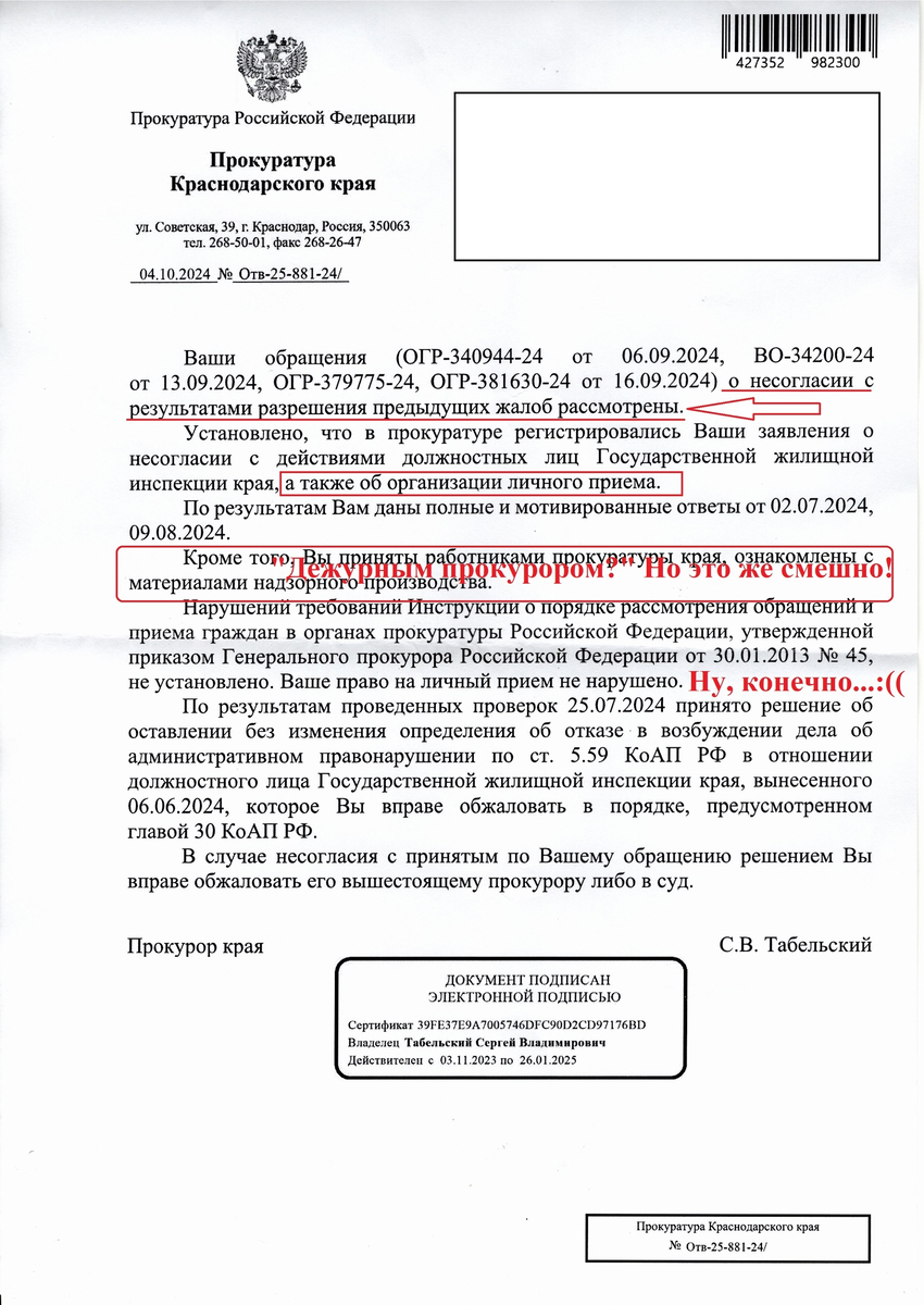 Сегодня я сходил в отделение почтовой связи, где получил формальную отписку 04.10.2024 № Отв-25-881-24/ от прокурора края С.В. Табельского, в котором он указал мне следующее: