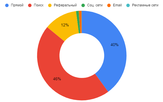 - Поиск – трафик из Google, Яндекс и других поисковых систем. Включает в себя трафик: платный (покупка рекламы в поиске) и органический (переходы из поисковой выдачи).