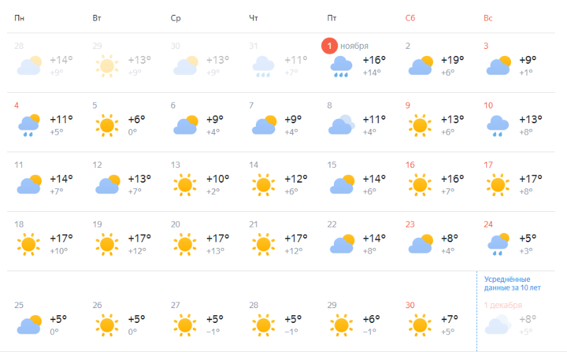 По данным сервиса «Яндекс Погода», ноябрь обещает быть относительно тёплым и сухим. Дни, когда возможны осадки – 1, 4, 10 и 24 ноября.