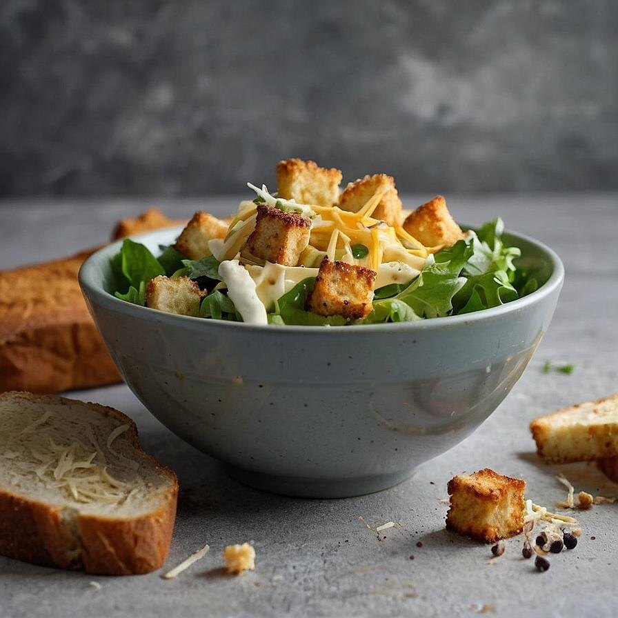 Ингредиенты: Хлеб нарезать кубиками около 1 см, подрумянить в духовке. Хлеб можно использовать как белый, так и черный ( по вкусу). Мне нравится белый - тостовый. Выложить поджаренный хлеб в чашку. Натереть на терке сыр. Очистить и потолочь чеснок. Добавить в хлеб чеснок и сыр, залить майонезом. Накрыть крышкой и дать постоять, чтоб хлеб пропитался майонезом. Выложить блюдо в салатник на лист зеленого салата. Сверху украсить сухариками и тертым сыром.