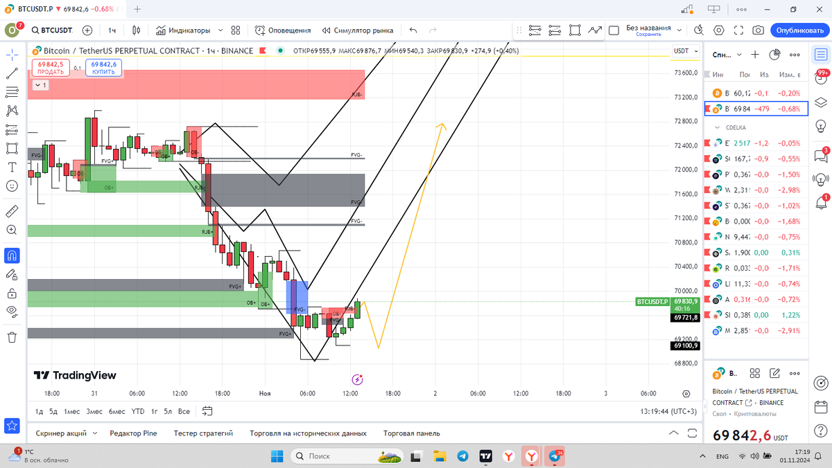 Всех приветствую и хочу сразу сказать -Я ЖЕ ГОВОРИЛ А что именно говорил? Я целую неделю говорил о том что жду коррекцию сперва я ждал ее скоротечной когда произошел пробой , но рынок ушел в консолидацию и я разделял свое мнение о дальнейшем движения. Часть меня считала что рынок обновит ATH и вот вот будем установлен новый максимум , но другая моя сторона более консервативная утверждала что рынок перегрет и мы должны остыть и уйти на коррекцию. Сейчас жду пробитие локального уровня сопротивления в 69.720 после чего закрепление выше и сбор ликвидности на уровне 72.000 Вот теперь читайте внимательно либо сегодня - завтра край 6 ноября мы установим новый ATH Открытый интерес упал до 21,8 млрд. долларов. Коэффициент убытков от дневной реализованной прибыли сократился, что указывает на небольшой перегрев рынка, когда инвесторы фиксируют прибыль. Кредитные плечи сокращаются. Аргумент объясняющий падение рынка. Переходи ко мне в телеграмм канал если хочешь больше информации https://t.me/Gi