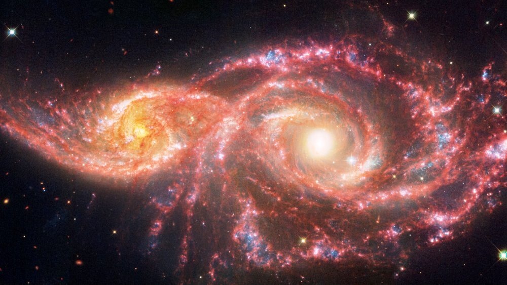 Жуткие цвета этой пары — результат объединения инфракрасного света, полученного телескопом «Джеймс Уэбб», с видимым и ультрафиолетовым, собранным «Хабблом». Места, где галактики «скользят» друг по другу, где их материал сталкивается, выделены более ярким красным. В последние десятилетия в этих галактиках было зафиксировано семь сверхновых (в Млечном Пути — одна в 50 лет). Каждая сверхновая приводит в движение газ и пыль, которые затем позволяют сформироваться множеству новых звезд.