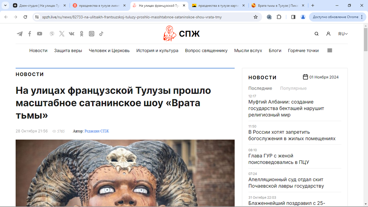 Это попалось вчера и совершенно случайно. 25-25 октября, во Франции на улицах Тулузы состоялось шоу «Хранитель храма – Врата тьмы», в котором огромные статуи демонов прошли через весь город, Три огромные роботизированные куклы мифологических существ: Лилит – наполовину женщина, наполовину скорпион, с паучьими ногами и бараньими рогами, а также паучиха Ариана и Минотавр Астерион выступали по всему городу. Этот перфоманс поставила французская уличная театральная компания La Machine. Короче, я не смогла скопировать эти фото из интернета. Вчера попался ролик. Такое потрясающее и завораживающее действо - просто вау! Если попадется посмотрите, не пожалеете!