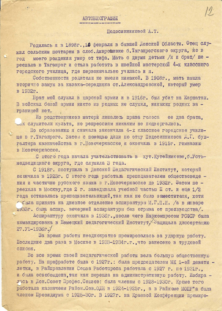 Про саму Антонину известно было мало, но вот окольными путями, из Ялуторовска, из Центра хранения страхового фонда (скорее всего в Сибирь документы в войну, в эвакуацию вывозили) на Подосинникову Антонину Тимофеевну прислали автобиографию и много новой для меня информации.