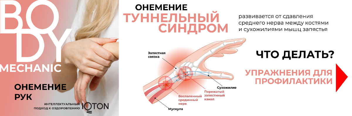 1. Туннельный синдром: Вызван сдавлением срединного нерва.