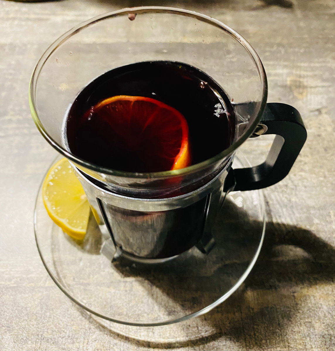 Доливаем в кастрюлю оставшееся вино, чтобы охладить глейнтвейн до нужной температуры. 60 градусов примерно. Кладем мед и выдавливаем лимон.