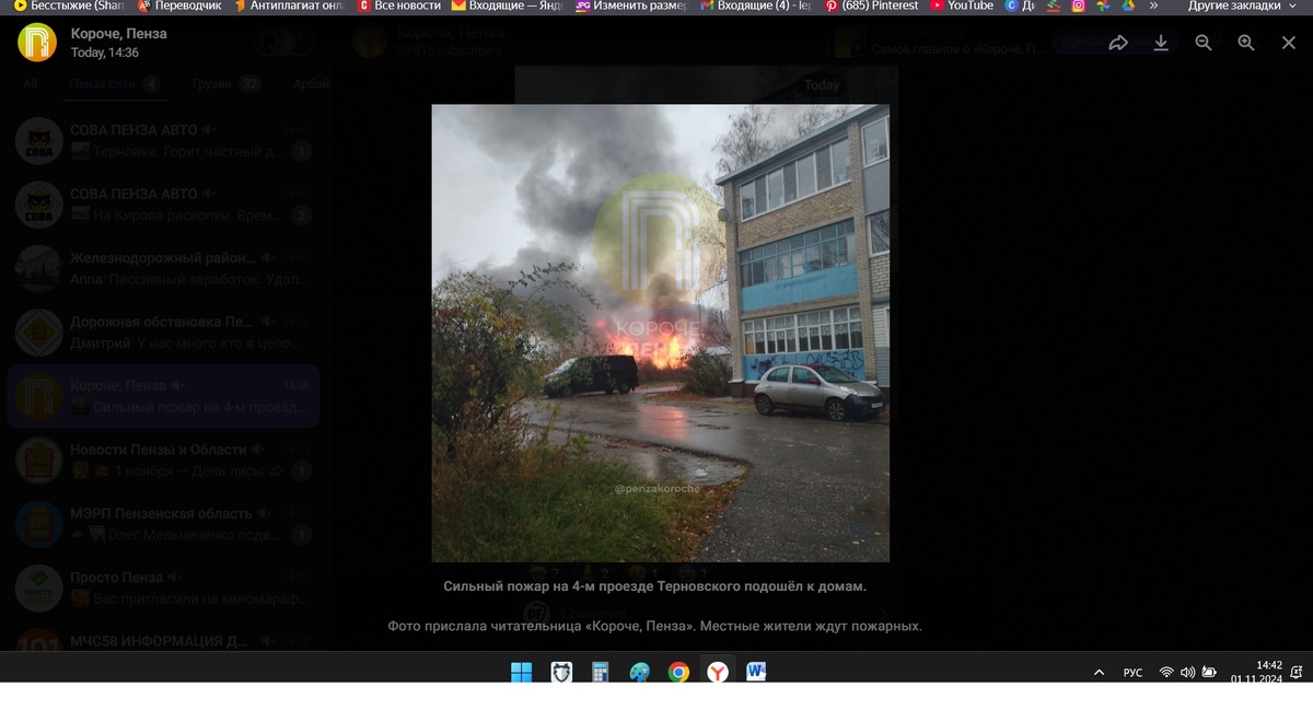 ЧП произошло сегодня, 1 ноября, в Пензе. В микрорайоне Терновка в третьем часу дня случился серьезный пожар. В соцсети появились видео, на которых можно увидеть как частный дом полыхает открытым огнем. Видео были сделаны из окна многоэтажки. На записи также заметен серьезный дым от пожара, который распространяется по округе. По словам автора поста, возгорание случилось в 4-м проезде Терновского, дом №6. Примерно в половине третьего очевидцы заявили, что пожар стал сильным и уже подошел к многоквартирным домам. «Горит нежилой дом. Точный адрес уточняется. Подразделения работают на месте», – сообщила журналистам руководитель пресс-службы ГУ МЧС России по Пензенской области Анна Шупилова.