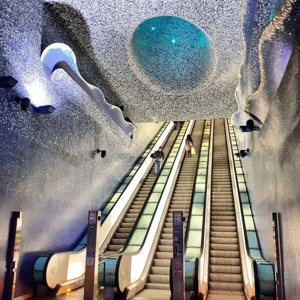 Путешествуя по Неаполю, можно оказаться будто в глубине океана… или космоса? Станция метро Toledo — одна из самых впечатляющих в мире. Её стены покрыты переливающейся мозаикой глубокого синего цвета, от которого захватывает дух. Итальянский архитектор Оскар Тускетс Бланка создал атмосферу космического пространства, добавив в центр станции ярко-голубую подсветку. Ощущение, будто вы находитесь внутри причудливой подводной лагуны, и даже забываешь, что на самом деле ты в подземке.