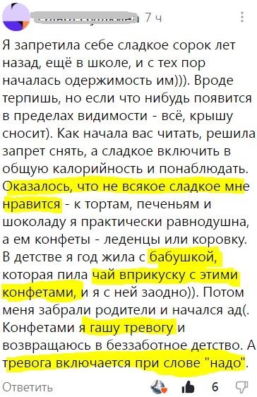 началась одержимость им))). Вроде терпишь, но если что-нибудь появится в пределах видимости - всё, крышу сносит)." - это отрывочек из комментария, а весь он звучит так: Я вынесла этот комментарий в статью, т.к. мне кажется, что он может принести пользу очень многим читателям. Смотрите, тут мы явно видим переходы от одной мысли к другой. Видим, как сознание начинает проникать в привычные, автоматизированные мысли, эмоции. К комментарию про сладкое я ещё вернусь, только хочу немного подробнее остановиться на методе написания своих мыслей. Вот ещё одна простая переписка под статьёй. Очень простой вопрос с моей стороны позволяет психике пойти в исследование темы и почти сразу обнаружить ответ: Вот это чувство, что "ой!, а я похоже себе ответила" - оно очень часто возникает, если мы начинаем писать свои мысли потоком, выключая "внутреннего критика" и позволяя себе осознавать себя, позволяя процессам быть именно такими, какими они идут. В общем-то, любая психотерапия делает именно это - ра