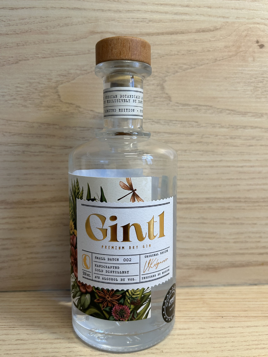 В преддверии ноября в мерзкую слякотную погоду вдруг захотелось что-то алкогольно-летнего. Вместе со второй половинкой вспомнили про джин-тоник (эта мешанинка победил в схватке с текилой-бум, вторым из трех коктейлей, которые мы себе позволяем). Взгляд на рынок джинов показал, что мой любимый Monkey 47 Schwarzwald Dry Gin кроме того, что почти эксклюзив, так еще, за него просят баснословные деньги. В качестве замены (ведь планировалось не пить в чистом виде, а использовать в коктейле) было решено использовать российский аналог по мотивам той самой макаки, а именно ярославский (сразу респект соседям КМ) джин Gintl, о котором слышал много лестных отзывов. Получайте немного моих реплик по поводу данного напитка, учтите особенно то, что я по джинам не спец. Представление. Просто бутылка и просто пробка с качественными и информативными этикетками. Изучаем контрэтикетку, где указан состав, вполне традиционен вода, спирт ректификат «люкс» и ботаникалы: саган, можжевельник, малина, брусника,