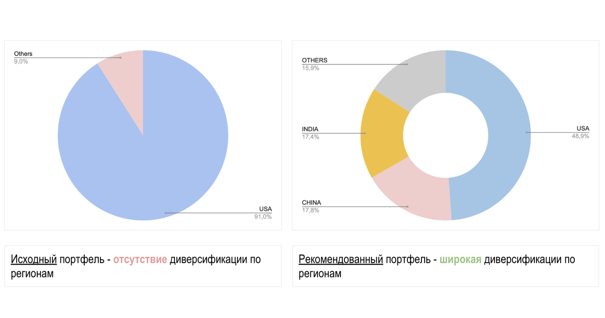 Друзья, в предыдущей статье мы разбирали такой важный параметр при формировании портфеля, как диверсификация по отраслям экономики. Если вы думаете о том, как улучшить свой портфель, но не понимаете за счёт чего можно увеличить доходность и снизить риск, то мы бесплатно готовы сделать аудит вашего инвестиционного портфеля, оценивая его надежность и эффективность согласно нашему подходу “бережных инвестиций". Мы проведем профессиональную оценку вашего портфеля на потенциальные риски и предложим свои рекомендации по его усилению. Просто переходите по ссылке 👇 Как видно из диаграммы слева, инвестиционный портфель практически не разделен между регионами, а более 90% акций составляет регион США. Это несет в себе высокие риски существенной "просадки" портфеля, т.к. отдельный регион может испытывать экономические трудности и находится в стадии падения, в то время как другой регион может испытывать экономический рост и его фондовые рынки будут расти. Это хорошо было видно на примере США и И