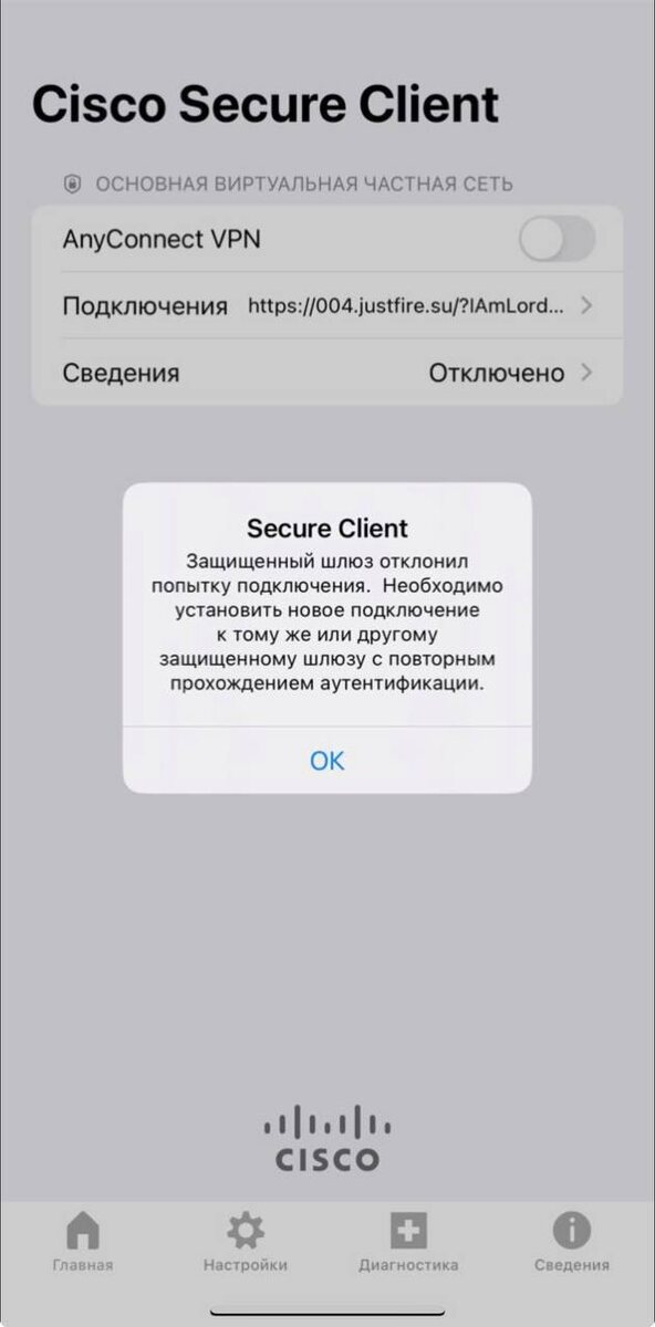 Если при подключении к VPN выходит ошибка из скриншота, то возможная причина – истечение срока действия VPN. То есть вам просто нужно продлить доступ. Если хотите проверить срок действия вашего VPN, выполните шаги, описанные ниже 👇 〰️Зайдите в бот VPN JustFreedom 〰️Нажмите «Назад» ❗️Так как сообщения в боте не обновляются, кнопку «Назад» нужно нажимать обязательно. 〰️Нажмите «Личный кабинет» 〰️Перейдите в «Мои доступы» Внизу экрана вы увидите, до какого числа был оплачен доступ и поймете, в этом ли причина ошибки при подключении. Если кружок рядом со сроком действия серого цвета, то у вас есть 7 дней на продление с момента, как истек доступ. Как продлить VPN мы подробно описали ЗДЕСЬ. ❗️Если по кнопке «Мои доступы» бот пишет следующее: «Пока что у тебя нет ни одного действующего VPN», – значит, уже прошло более 7 дней после окончания доступа и вам нужно заново купить и настроить VPN. Для этого вам нужно нажать на «Личный кабинет» ➡️ затем выбрать «Новый VPN» ➡️ далее оплатить и зан