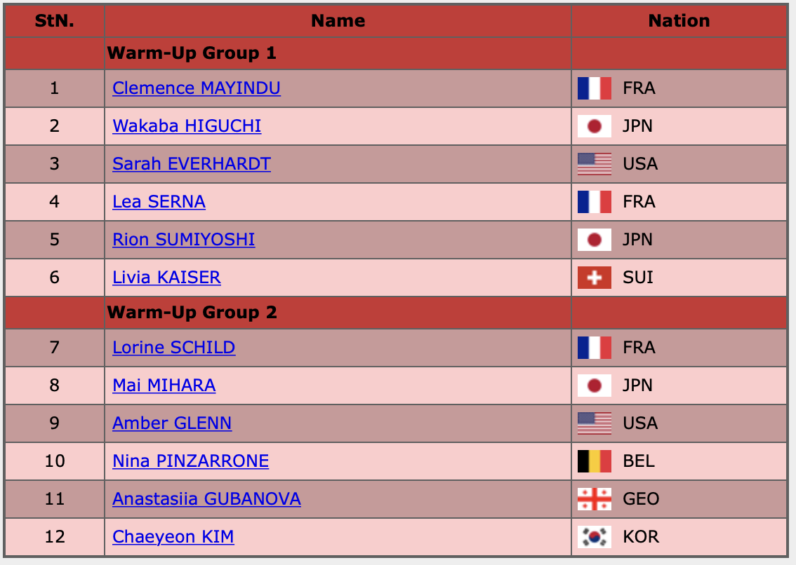 Списко участниц в порядке выхода на лёд: