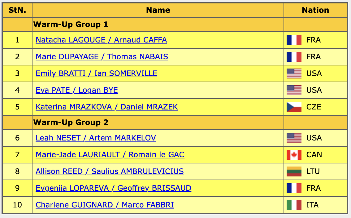 В танцах лично для меня этот этап не самый интересный, но ради блога всё равно смотрела от начала до конца. Список участников в порядке выхода на лёд: Начали с твиззлов - на 4 и 3 уровень. Диагональная дорожка шагов только на 1 и 2 уровни. Поддержка во вращении четвёртого уровня. Паттерн второго уровня. Хорео секвенция не очень интересная. АВВА. Мне показалось, что не хватает резкости в движениях и раскрепошённости, выглядели немного зажато. Результат РТ: 65.89 Твиззлы в начале не 4 уровень у обоих, хотя не очень синхронно. Паттерн третьего уровня. Дорожка 3 и 2 уровня. Поддержка только на 3 уровень. Хорео секвенция - ничего необычного тоже. Мне не понравилось скольжение этой пары, и в музыке будто бы не было чёткого финала, музыка словно просто оборвалась. Результат РТ: 64.03 Начали с дорожки - на 3 уровень у обоих. На твизлах было расхождение, причём оба раза, но по критериям на 4 уровень выкатали. Паттерн на 3 уровень. Хорео секвенция зрелищная, и в финале эффектная поддержка. Ка