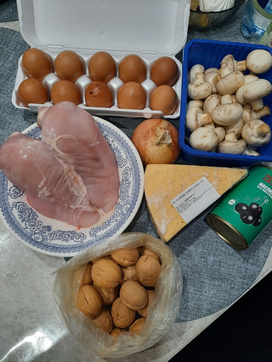 Нам нужна грудка, шампиньоны, яйца, лук, сыр и грецкий орех. Маслины в итоге добавлять не стала.