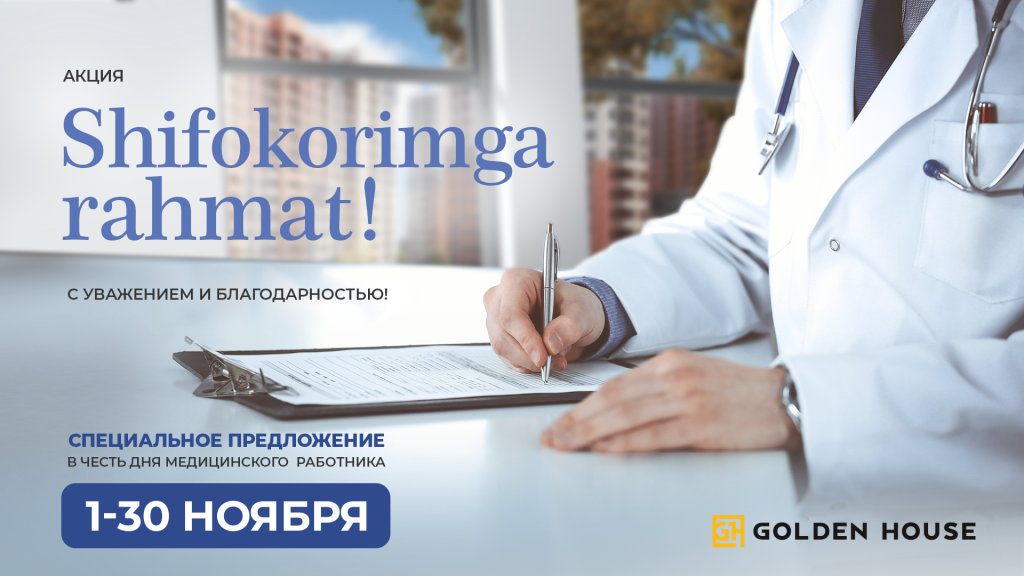 Golden House объявляет о запуске акции, приуроченной ко Дню медицинского работника. В знак уважения и благодарности медицинским работникам за их ежедневный труд на благо общества, компания Golden House предлагает особые условия на покупку квартир в своих жилых комплексах. С 1 по 30 ноября действует акция, дающая возможность всем медицинским работникам приобрести жилье в жилых комплексах Harizma, Assalom Jomiy, Assalom Havo и Assalom Do’stlik на выгодных условиях. Все квартиры передаются с готовым ремонтом, что позволяет сразу заселиться и начать жить с комфортом. Условия акции: Golden House предлагает медицинским работникам не только высококачественное жилье, но и гибкие финансовые условия, чтобы облегчить процесс приобретения недвижимости. Для участия в акции необходимо предоставить документы, подтверждающие вашу профессиональную деятельность в медицинской сфере. Акция действует с 1 по 30 ноября 2024 года, предоставляя медикам возможность приобрести жилье по выгодным условиям. Контак